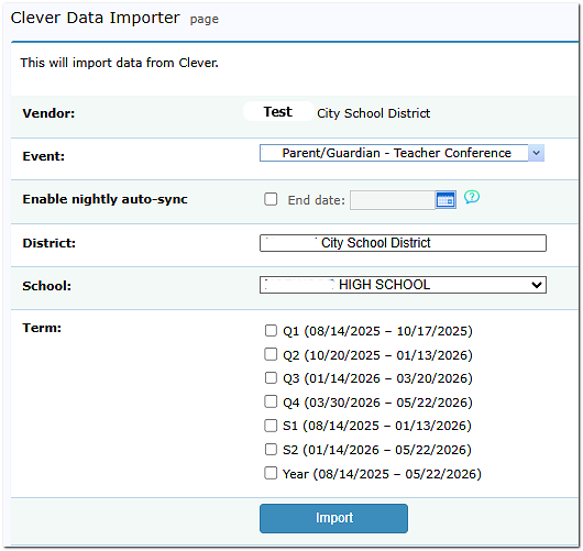 - Once accepted we will set up your account for the Clever data sync, and you will create and event on your account. Then when you import your files, you will see that the importer is set up for Clever. You will select the Terms to import which will kick off the sync.
