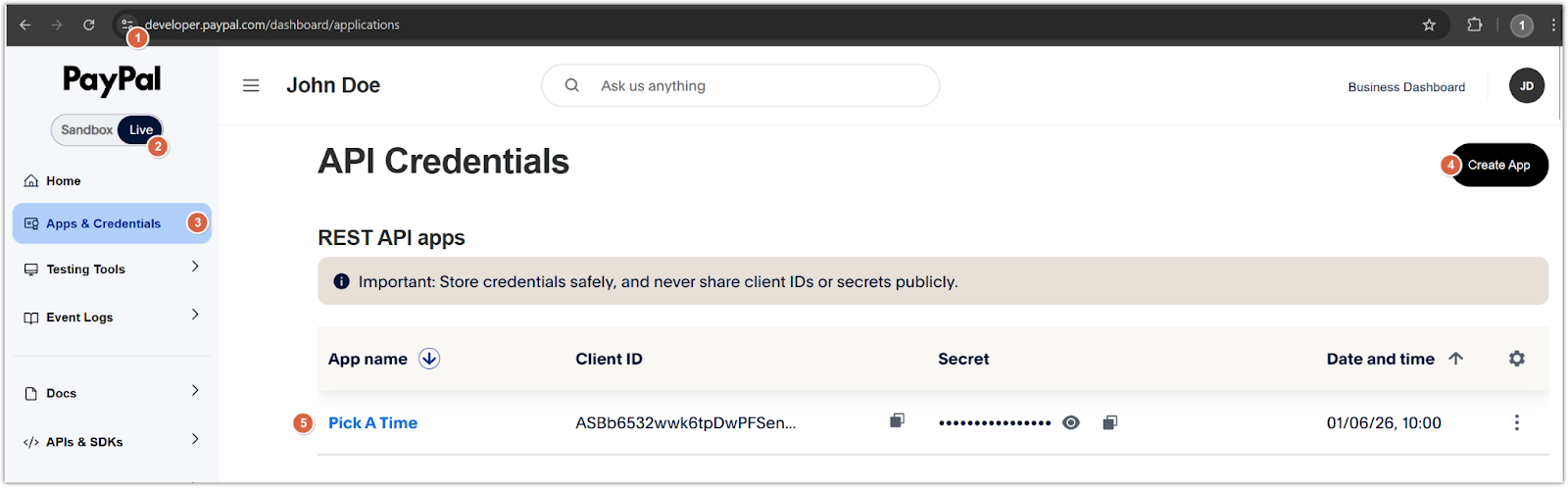 - Switch to Live Mode (not Sandbox), and open the "Apps & Credentials" tab.