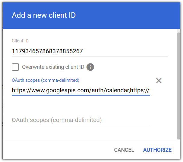 - In the OAuth scopes (comma-delimited) paste the following: https://www.googleapis.com/auth/calendar,https://www.googleapis.com/auth/userinfo.email,https://www.googleapis.com/auth/admin.directory.user.readonly,https://www.googleapis.com/auth/admin.directory.group.readonly,https://www.googleapis.com/auth/calendar.events