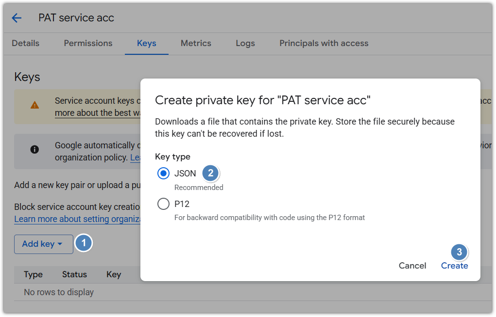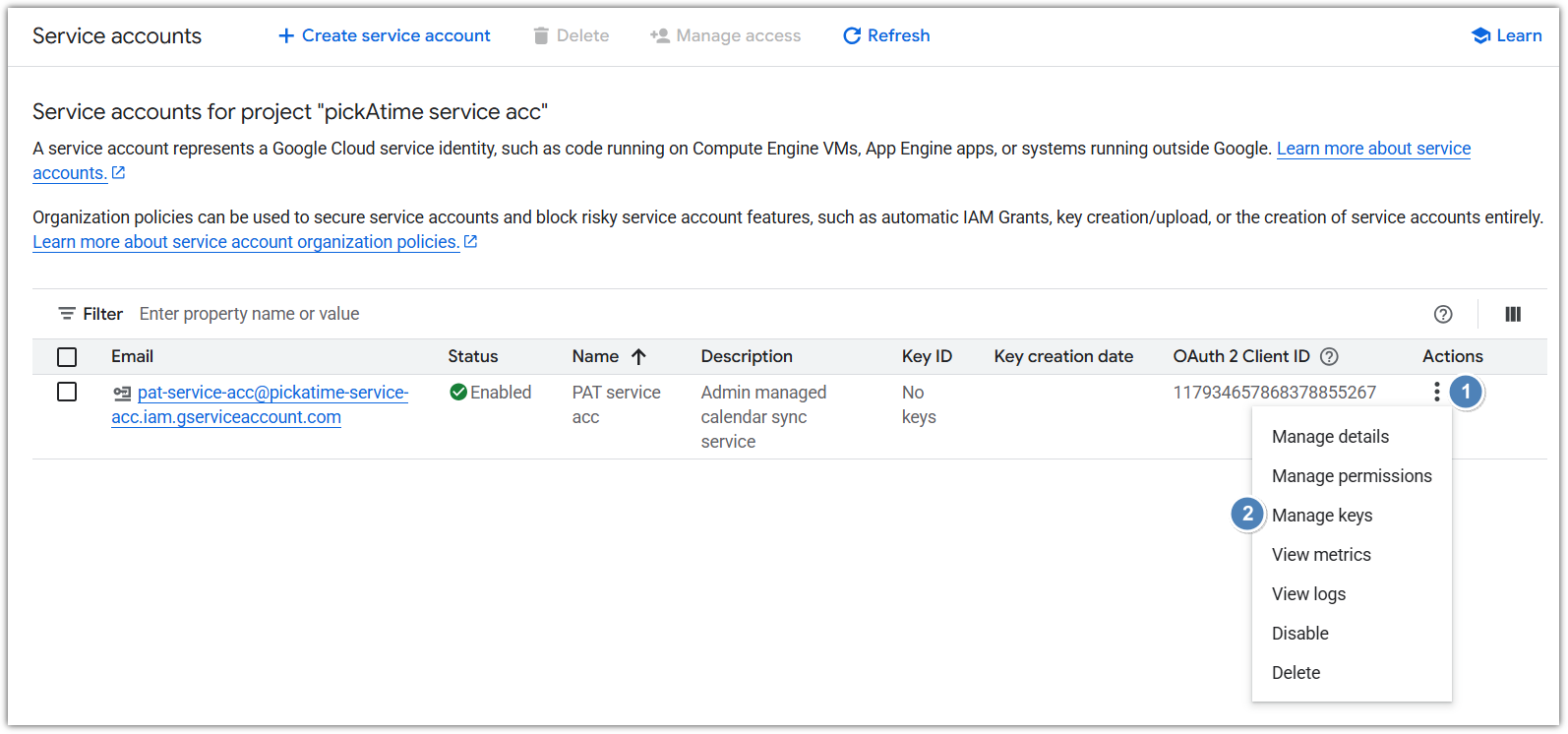 9. For the service account you created, on the far right-hand side in the Actions column, click 3 dots Menu button > Manage keys