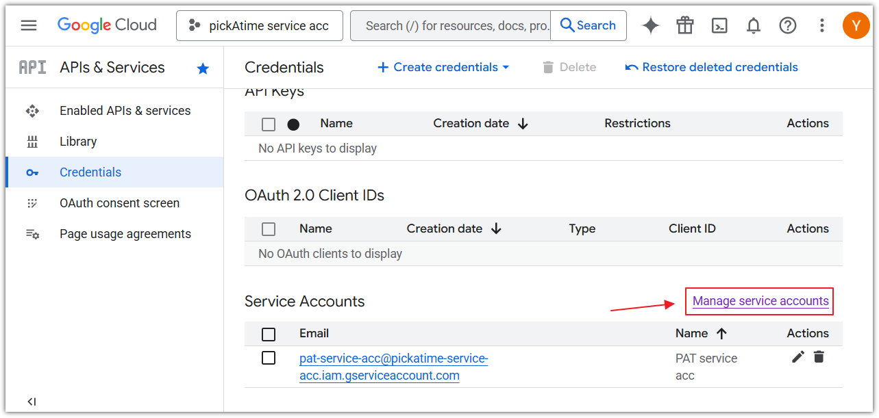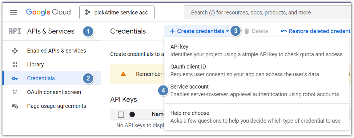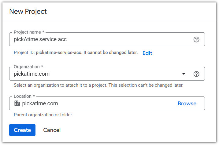 - Enter a Project name and click Create. In this example, we set the name pickAtime service acc.