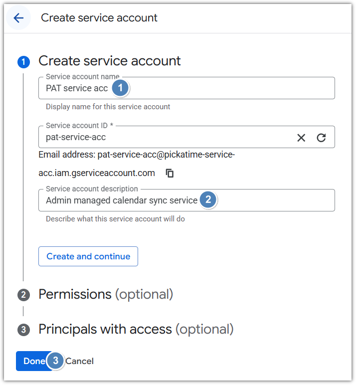 - Add the Service account descriptions, i.e. ‘Admin managed calendar sync service’