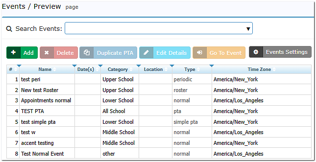 The Events Preview page allows you to create, delete, and edit certain event details.