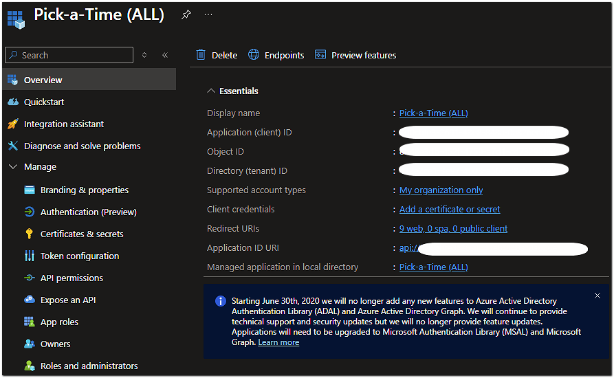 Go to App Registrations → select your existing pickAtime app