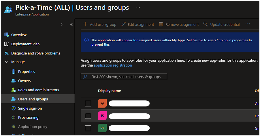 11. Next, navigate to Enterprise Applications in Entra ID, Select correlating Application, and go to “Users and Groups.” Here, add groups that you want to have access to the PickATime account.