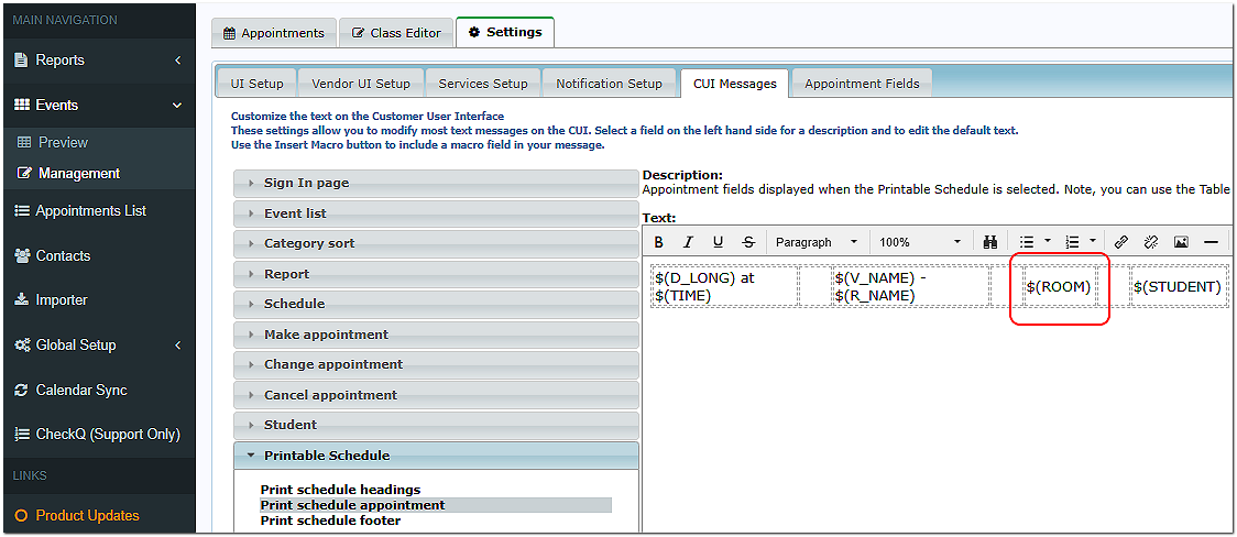 To do this, go to Events Management > Settings/Notification Setup and review your Confirmation and Reminder emails. They should have the option to Replace the Email Body with the Printable Schedule of Appointments checked. Within the Settings/CUI Messages > Printable Schedule section, you will see that the $Room macro is present.