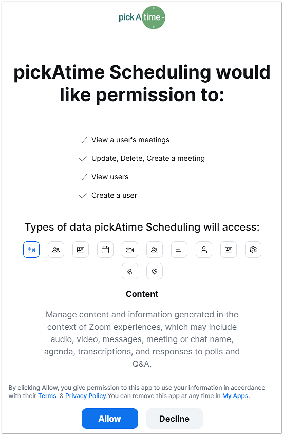 To use the Zoom Integration with pickAtime, you will use the Admin Managed application.
